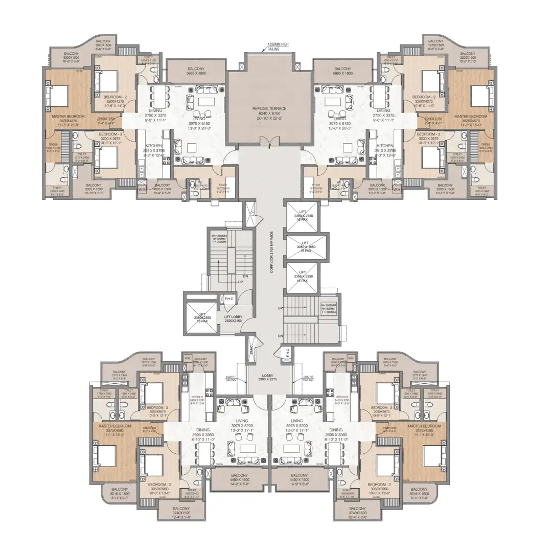 cluster of 4 flats per floor (2nos. 3 bhk & 2nos. 4 bhk)